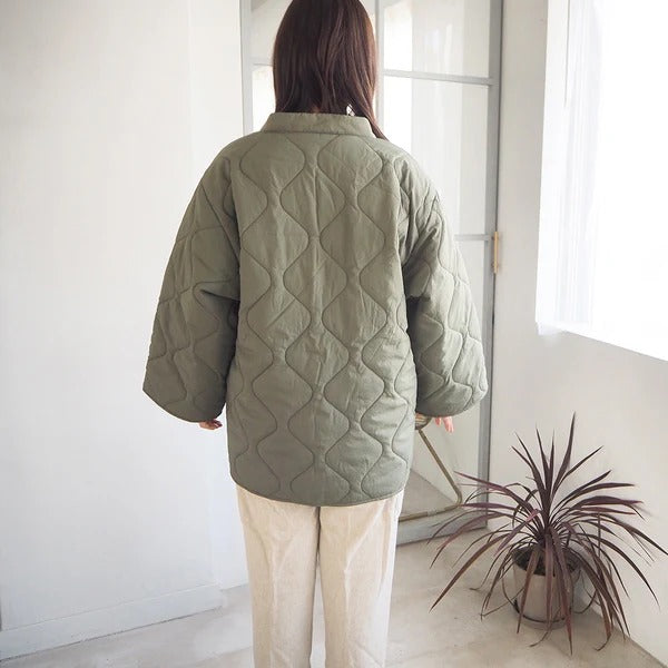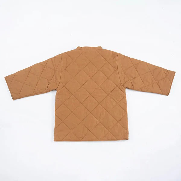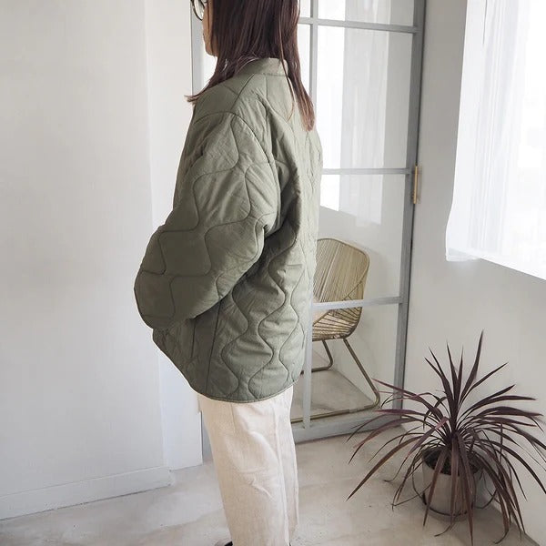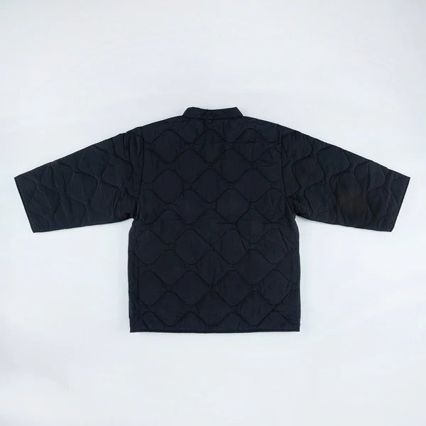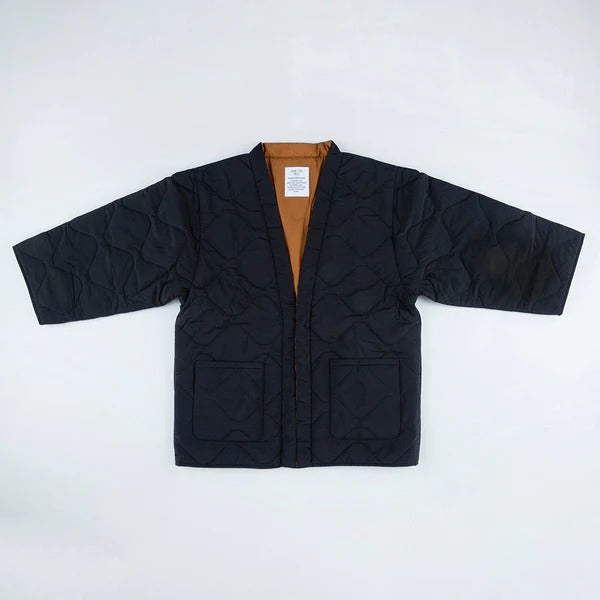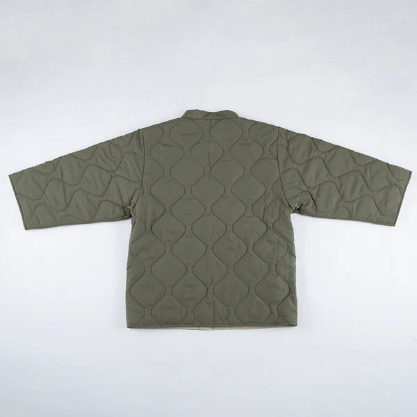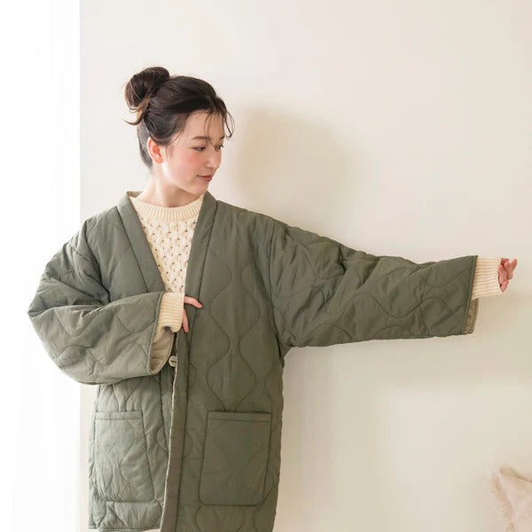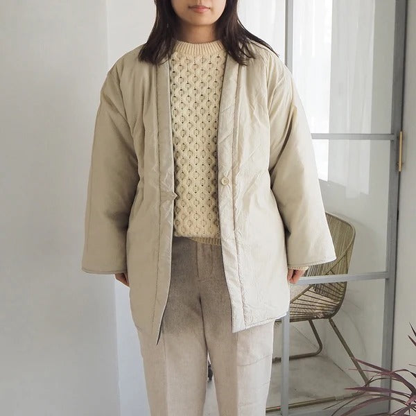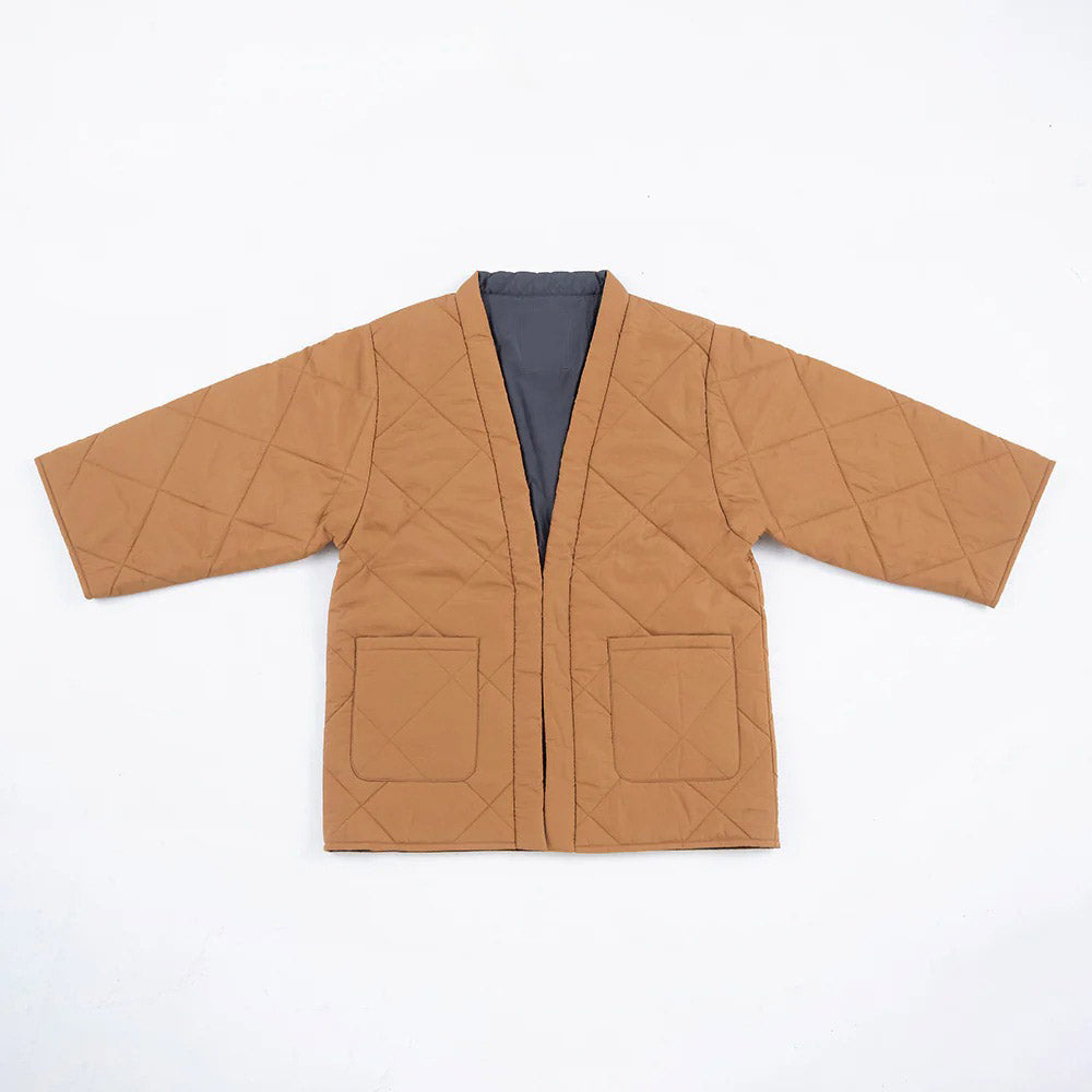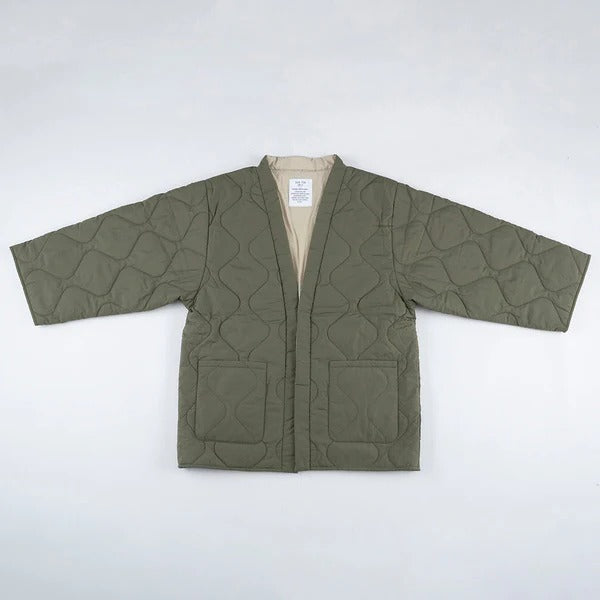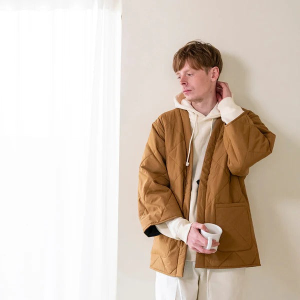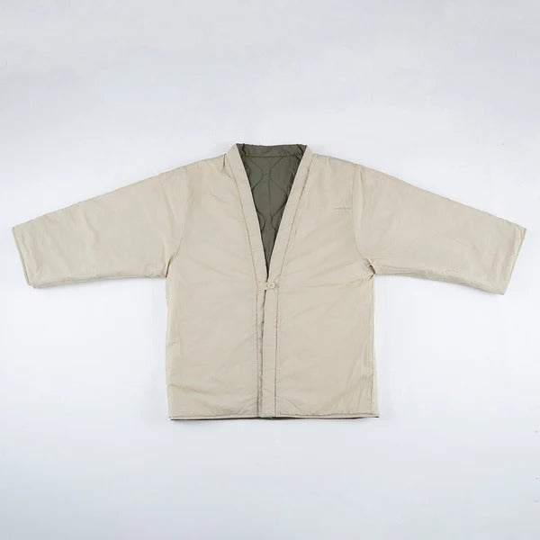 畳んで付属の巾着に収納することができ軽量で持ち運びしやすいので、 キャンプなどのアウトドアにもオススメ。リバーシブルで着用できます。内側の面はキルティングなしになります。