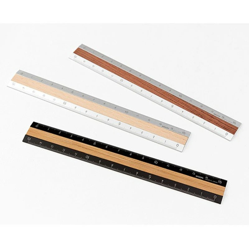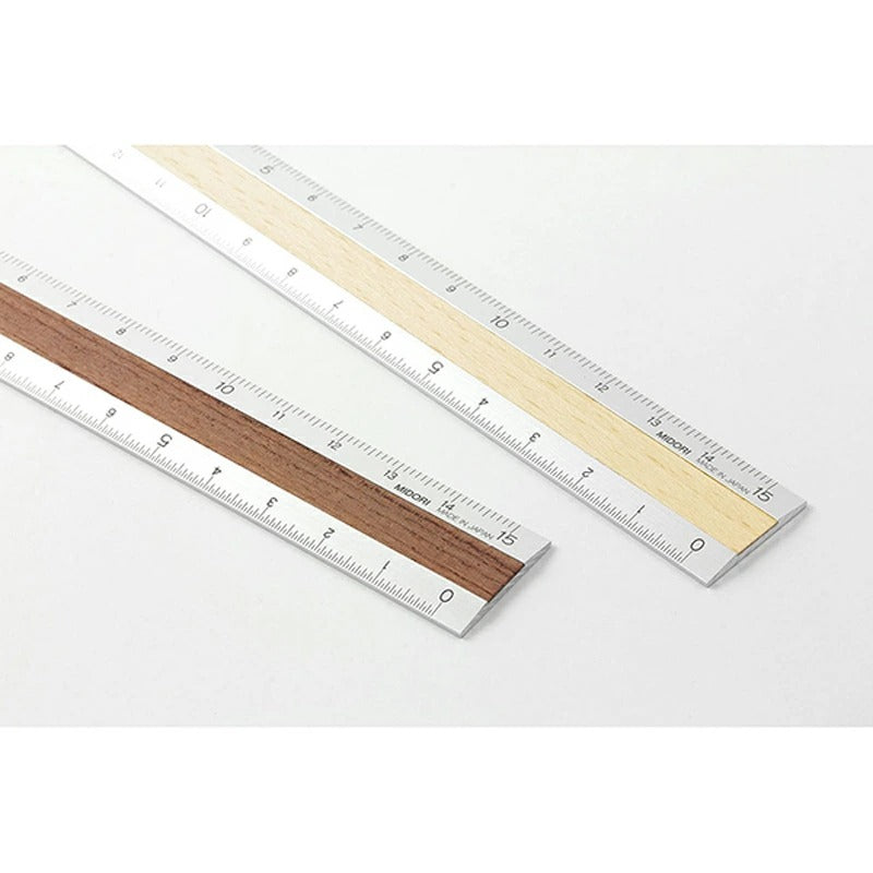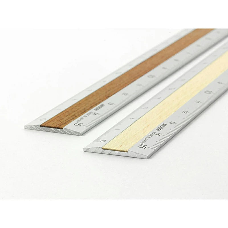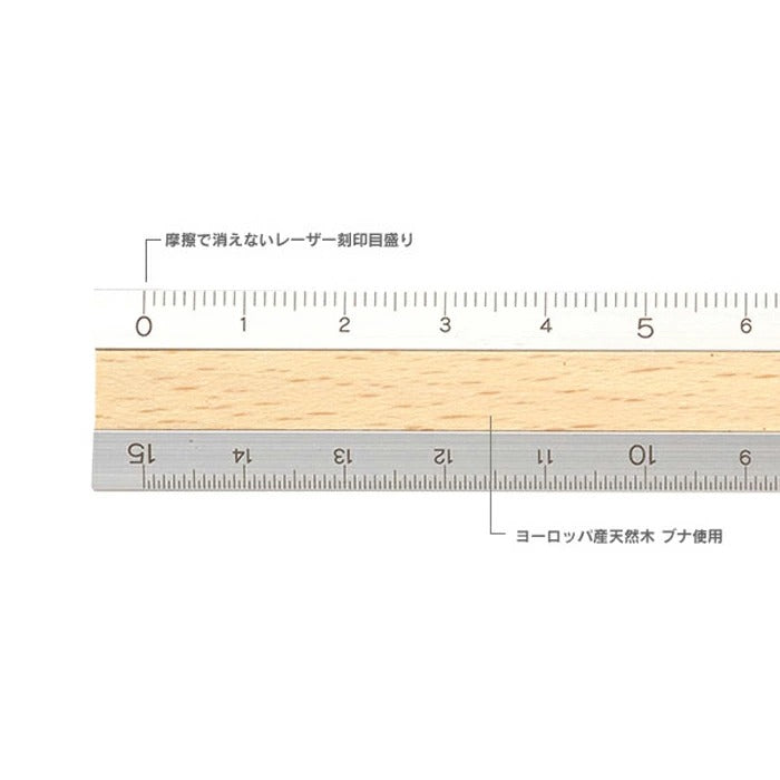 軽くて強度のあるアルミ素材と、天然木を組み合わせたスタイリッシュな15cm定規です。