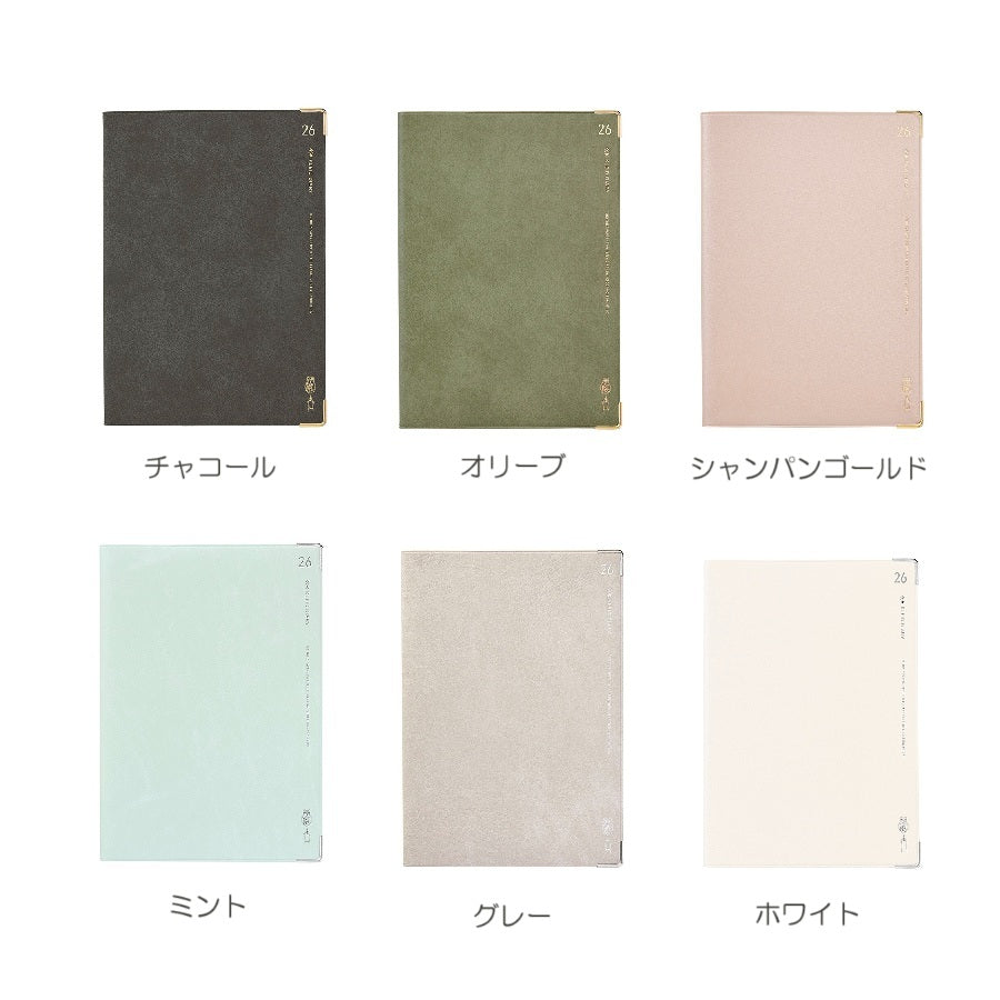 ※チャコール、オリーブ、シャンパンゴールドはクリーム色の紙とゴールドの天金加工と金具、