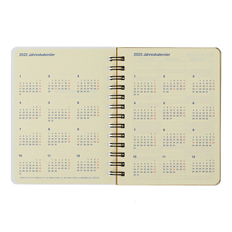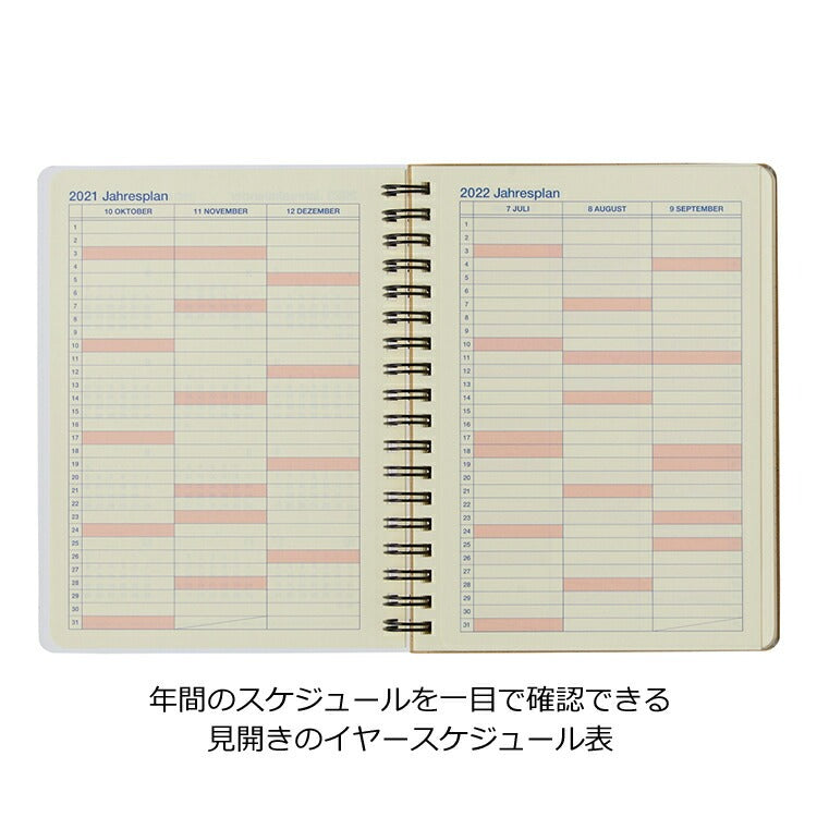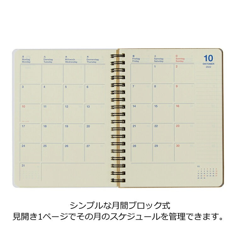 見開き1か月のカレンダータイプのマンスリーと年間スケジュール欄のみというシンプルな構成。また、巻末にはチケットやレシートなどを入れるのに便利なPPポケットが5枚付いています。表紙には透明フィルム加工が施されているため、1年間しっかりと使えます。