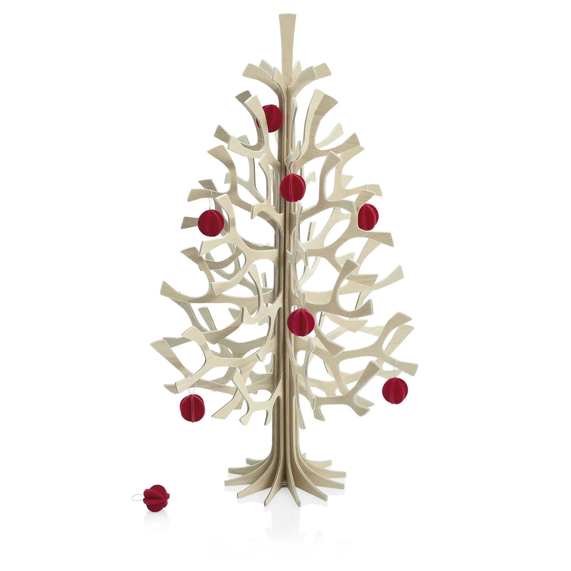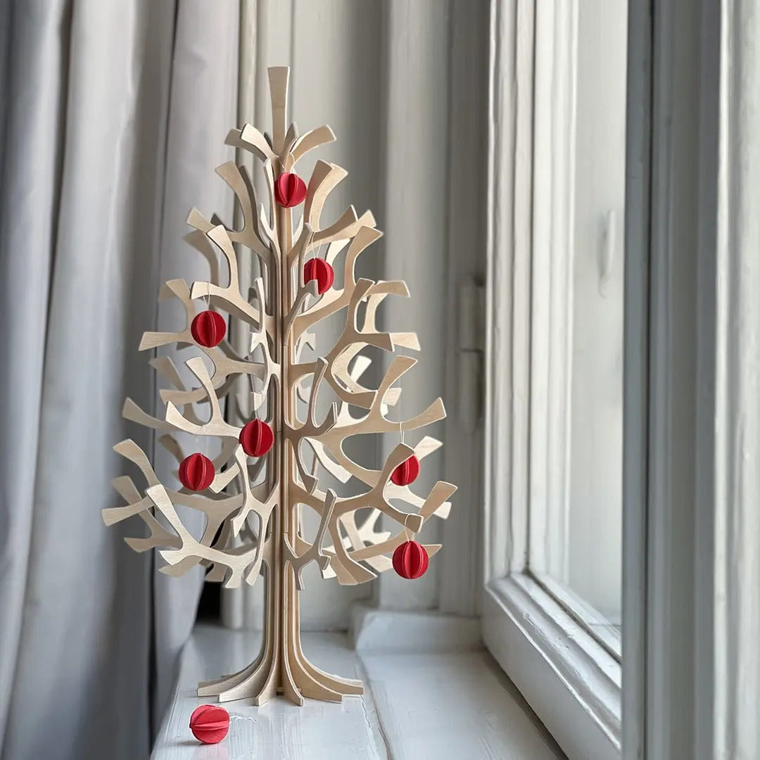 フィンランドのバーチ(白樺)でできた、木製クリスマスツリーと赤いミニボールのオーナメントのセットです。